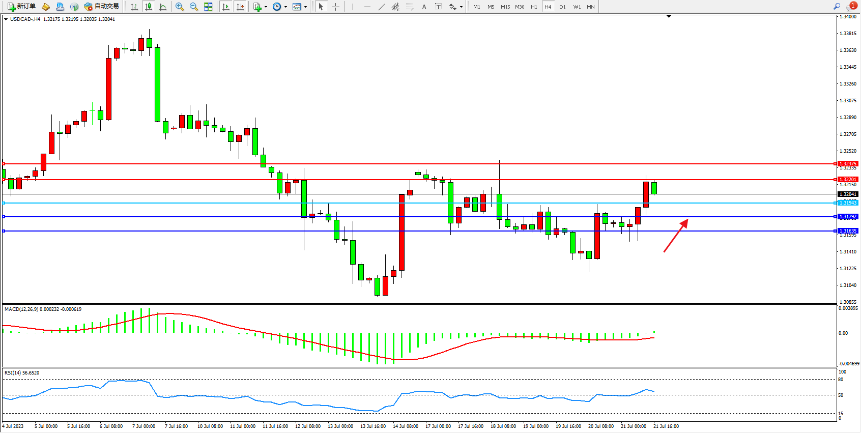 美元加元USDCAD——4小时K线图显示: