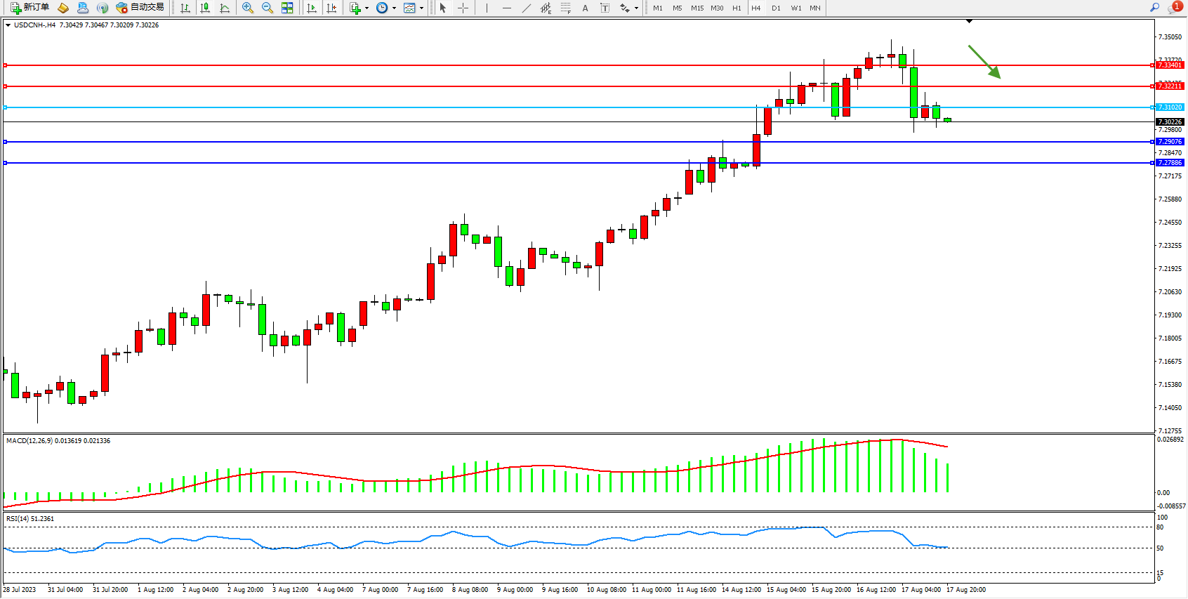 美元人民币USDCNH——4小时K线图显示: