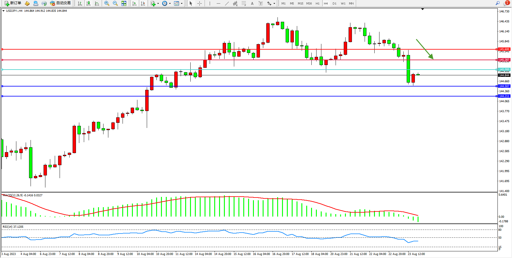 交易策略:145.000下方看跌,目标144.507  144.211