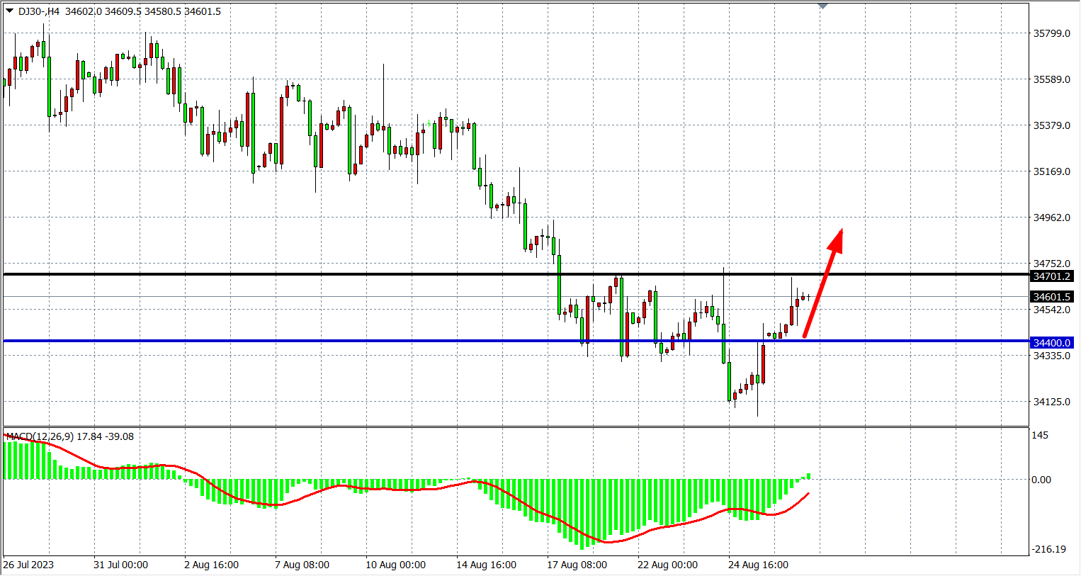 4小时图看,道指延续反弹至24700附近,MACD开始开始上穿零轴,支撑上移34400,上方若涨破34700则看35000-35400。