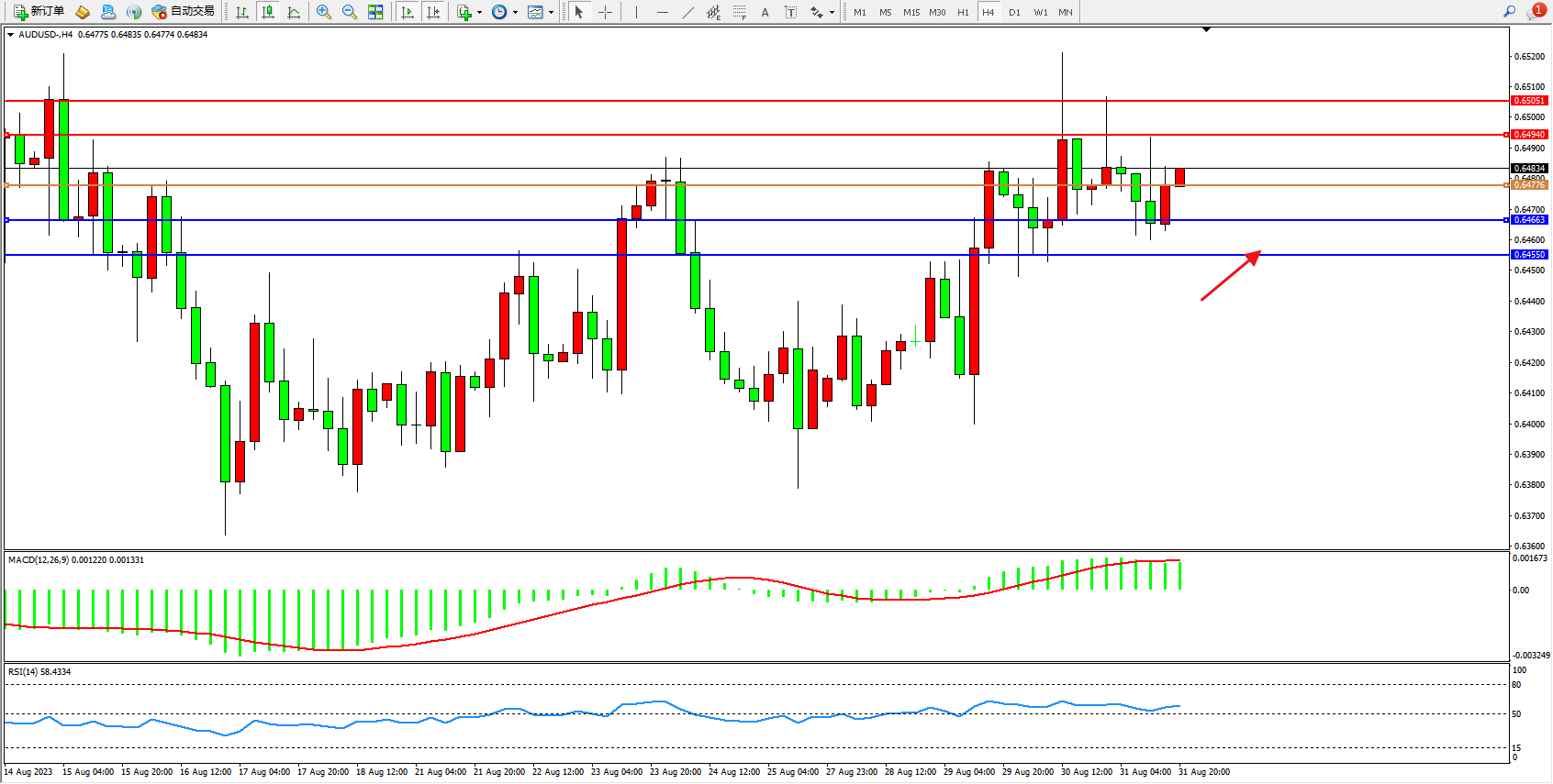 澳元美元AUDUSD——4小时K线图显示: