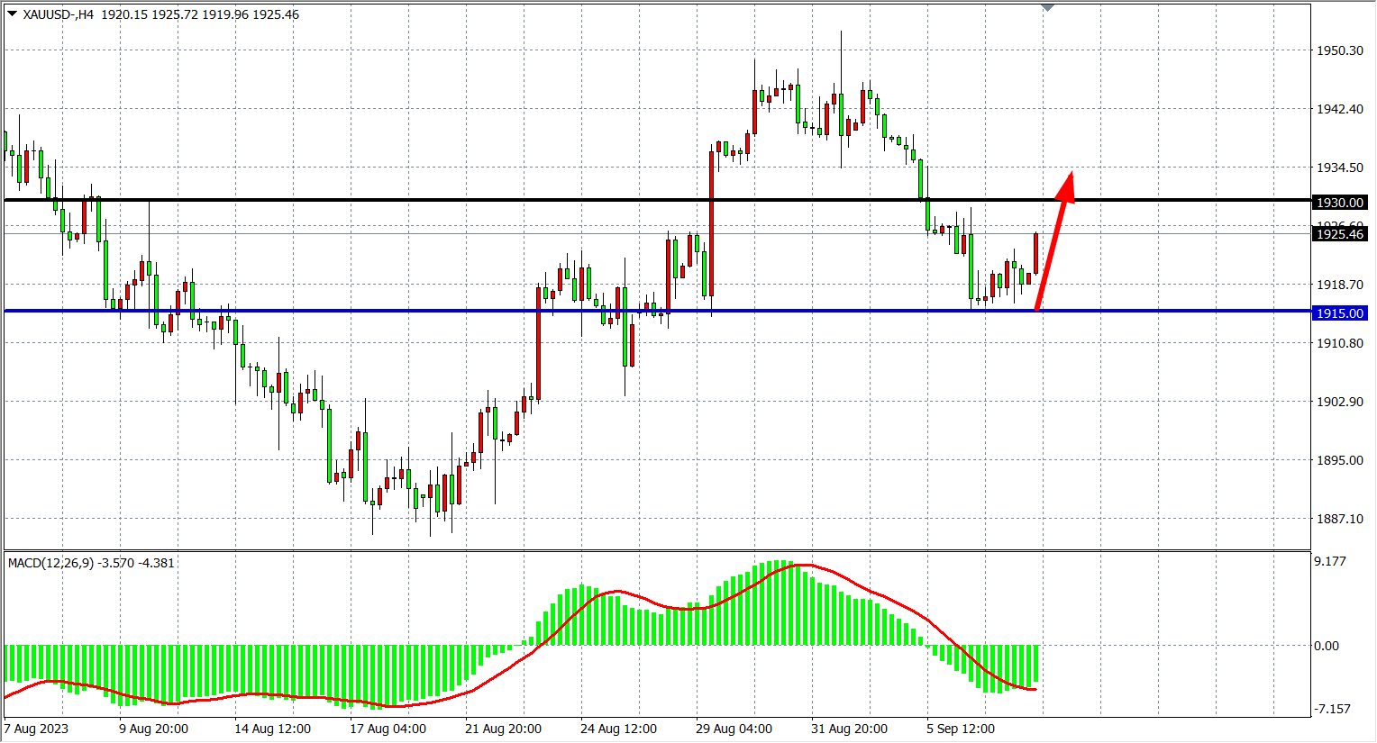 4小时图看,黄金在1915附近反弹,MACD在零轴下缩量,短期趋势进入盘整,支撑关注1915附近,上方阻力看1930-1940附近。