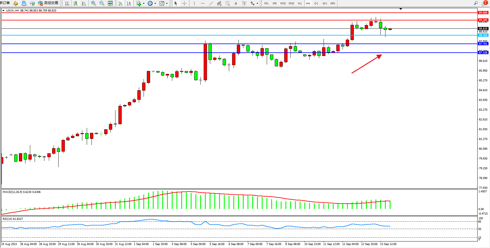 原油USOil——4小时K线图显示: