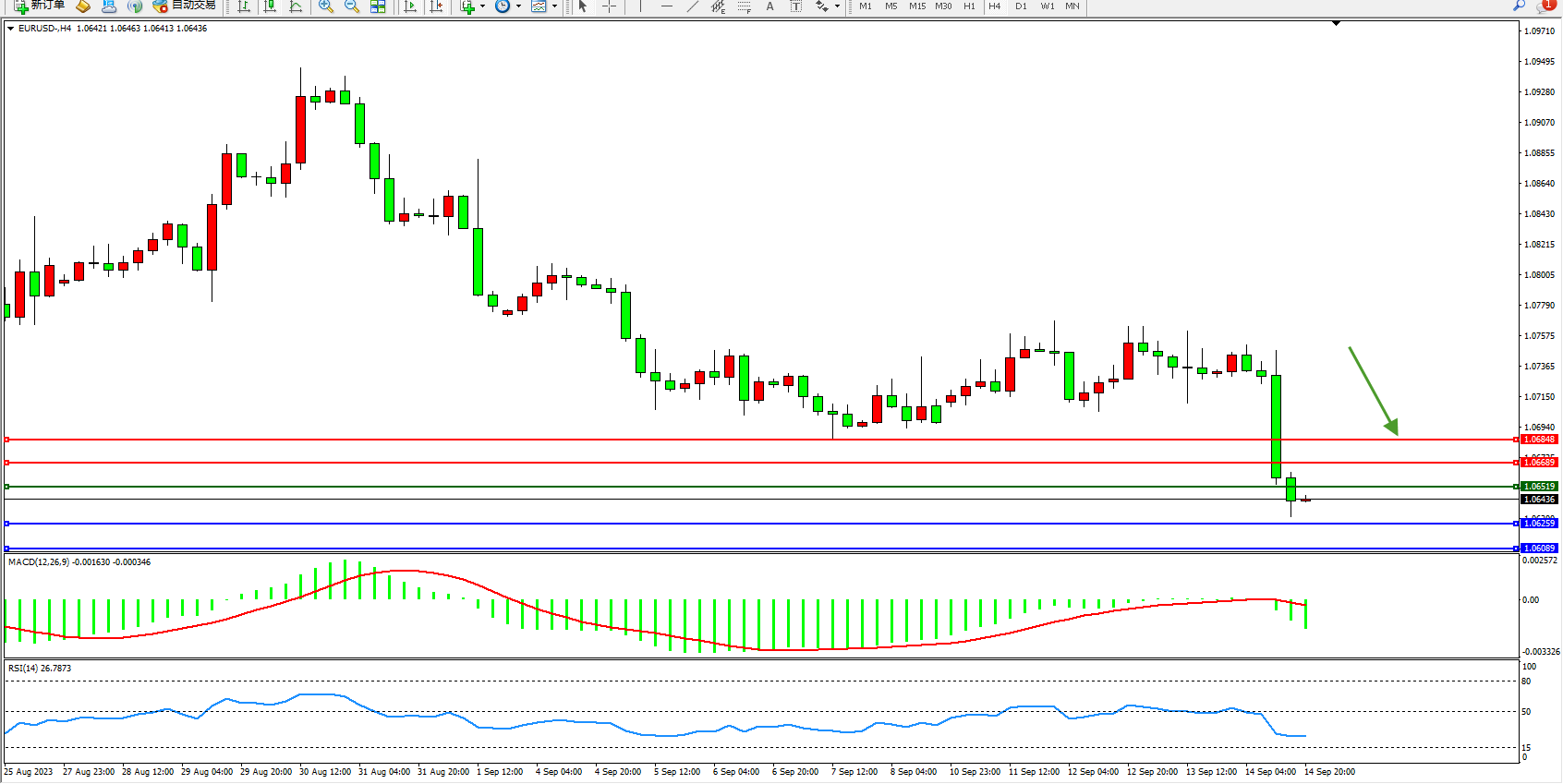 欧元美元EURUSD—4小时K线图显示: