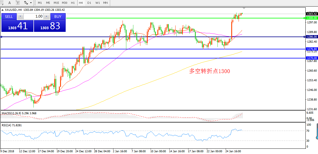 4小时图看,黄金在1280附近盘整后逐渐站稳,昨日突破并站稳了1300阻力。亚盘时段预计有所调整,但整体走势偏多。