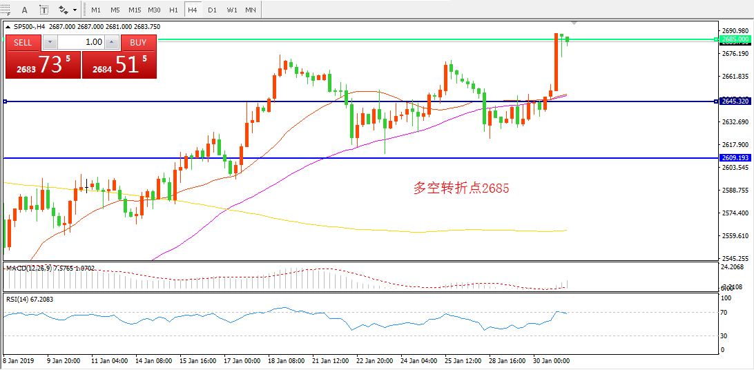 美联储新年首个FOMC会议暂不加息,维持2.25%-2.5%利率不变。美联储承认通胀预期下降,将经济表现从“强劲”下调至“稳固”。货币政策决策者对在需要时放缓缩减资产负债表步伐持开放态度。美联储如期不加息,立场鸽派,外加美股财报靓丽推动股市大涨。标普500指数收涨41.05点,涨幅1.55%,报2681.05点。
