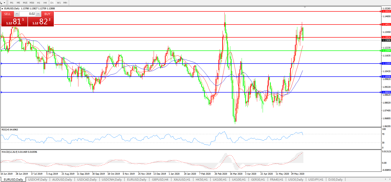 随着对疫情再度爆发的担忧加剧,市场情绪生变,风险资产齐齐下挫。数据显示,美国一些州的感染率有所上升。美媒分析称,尚不清楚病例增加是否与经济活动增加有关。健康专家还说,现在也不能说过去两周美国国内的大规模抗议活动是否导致了更多的感染。瑞穗银行外汇策略师Neil Jones表示,疫情爆发第二波的风险可能成为欧元兑美元汇率的主要决定因素。除非欧元区的封锁限制继续放松,各国政府一致通过建立复苏基金的提议,否则欧元可能会继续下跌。随着投资者仓位更加平衡,技术图表闪烁着警告信号,市场不太可能追高。分析师指出,由于仓位调整更加均衡,投资者可能不会像本月早些时候那样大举推高欧元。此外,技术面显示,深度回调可能即将来临。顺势指标等动能指标已经发出了看跌信号,而欧元的相对强弱指数RSI正背离价格走势。