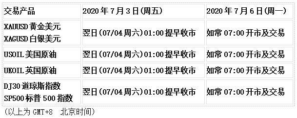 因应美国市场美国独立日假期,以下产品的交易时间将于07/0401:00提早收市,敬请阁下留意知悉!
