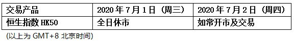 因应香港回归假期,香港市场恒生指数HK50将于2020年7月1全日休市,敬请阁下留意知悉!