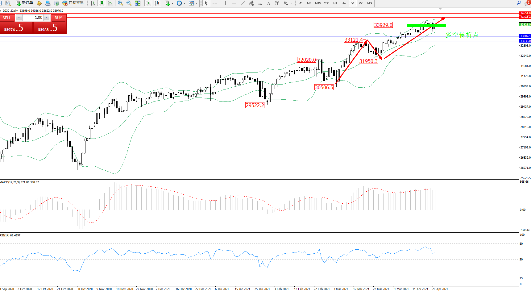 道琼斯指数4月21日(周三)收盘上涨308.61点,涨幅0.91%,报34129.91点;美股收盘,道指初步收涨超300点;亚洲的新冠感染病例大增造成不安情绪升温,使风险偏好受到打击、投资者紧张焦虑。市场密切关注这种担忧情绪将对全球经济复苏造成何种影响。美国前财长批评美国总统拜登的1.9万亿美元的刺激法案。提供的需求将远远超过对经济潜能的任何合理预估,意味着价格将大幅上涨。过量的刺激将导致物价大幅上涨,并迫使美联储加息,可能会扼杀复苏甚至导致衰退。