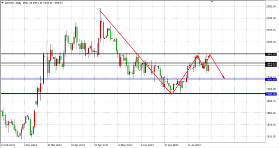 周四(7月27日)美国二季度GDP意外加速增长,6月耐用品订单增速也远超预期,增加“软着陆”的预期,另外,欧洲央行如期加息25个基点后,暗示可能不会进一步加息。受此提振,美指止跌反弹,现货黄金一度跌至1940美元附近,较日高暴跌近40美元,收跌1.37%。