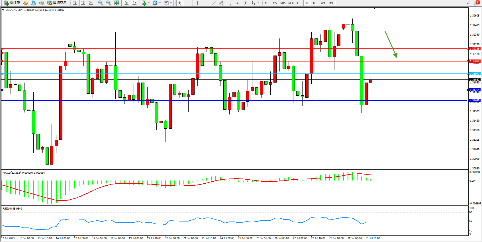 美元加元USDCAD——4小时K线图显示: